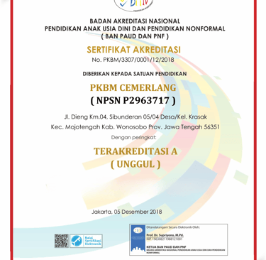 Ijin Operasional PKBM : SK DInas Pendidikan Pemuda dan Olahraga Kab. Wonosobo
