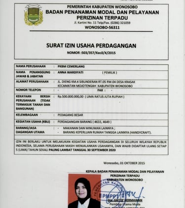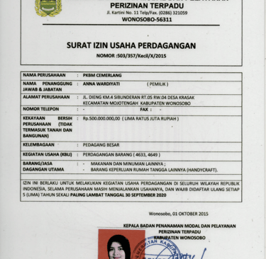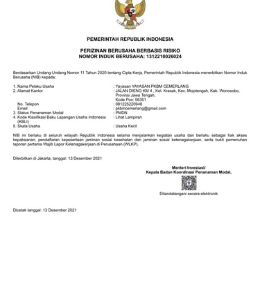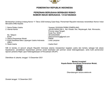 c. No. 41/001/2017, No 001/PKBM/CEM/SK03/II/2017NIB (Nomor Induk Berusaha) No. 1312210026024
