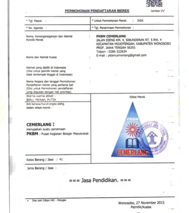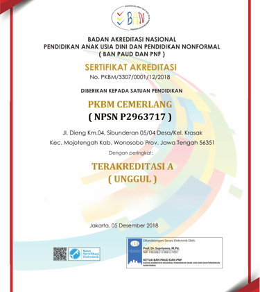 PKBM CEMERLANG didikan dan mulai beroperasional pada 2 NOvember 2009 dan ternit SK pada 1 Januari 2010 dengan legalitas :